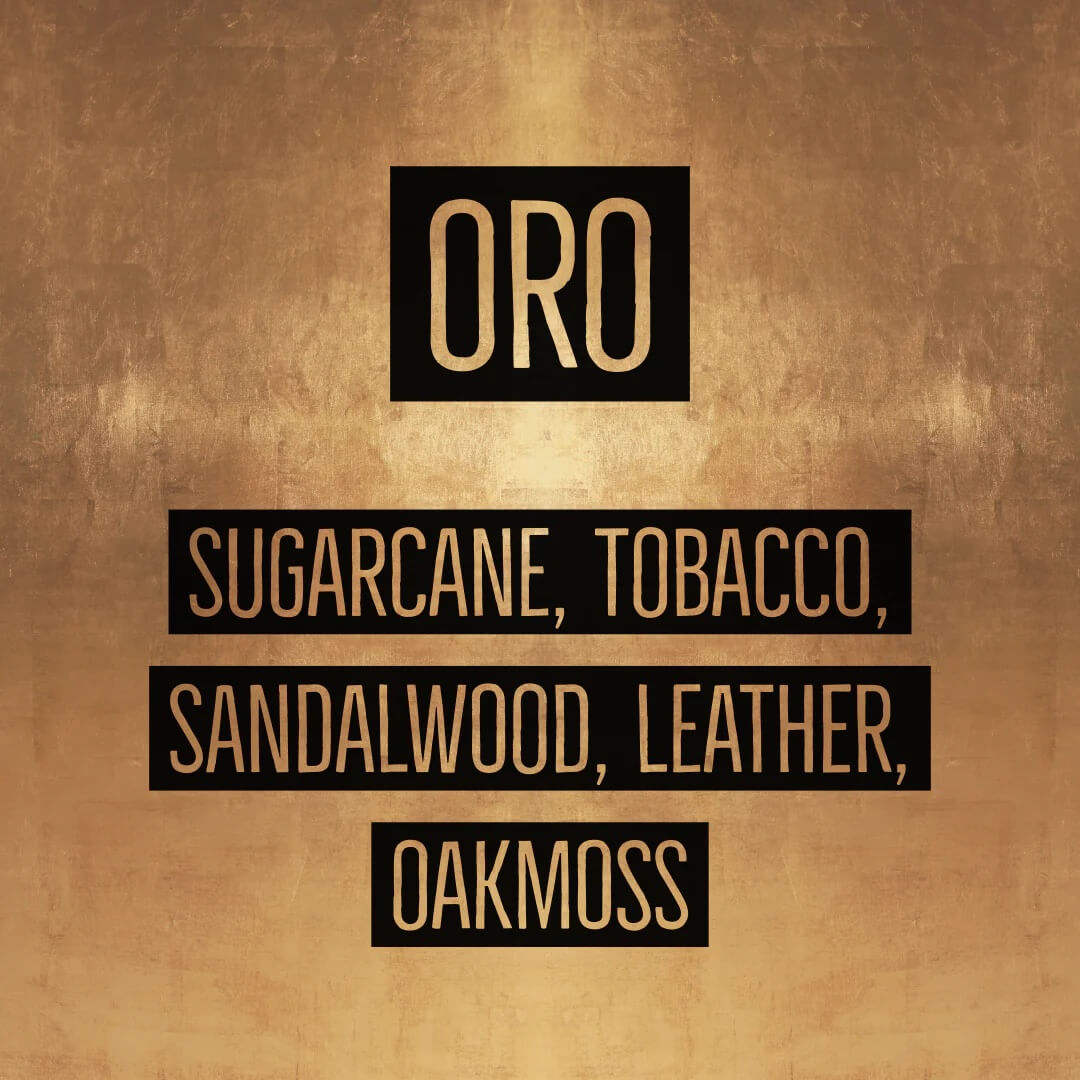 Scent: Oro - slightly sweet, earthy scent with notes of sugarcane, tobacco, and sandalwood rounded out by notes of leather and oakmoss